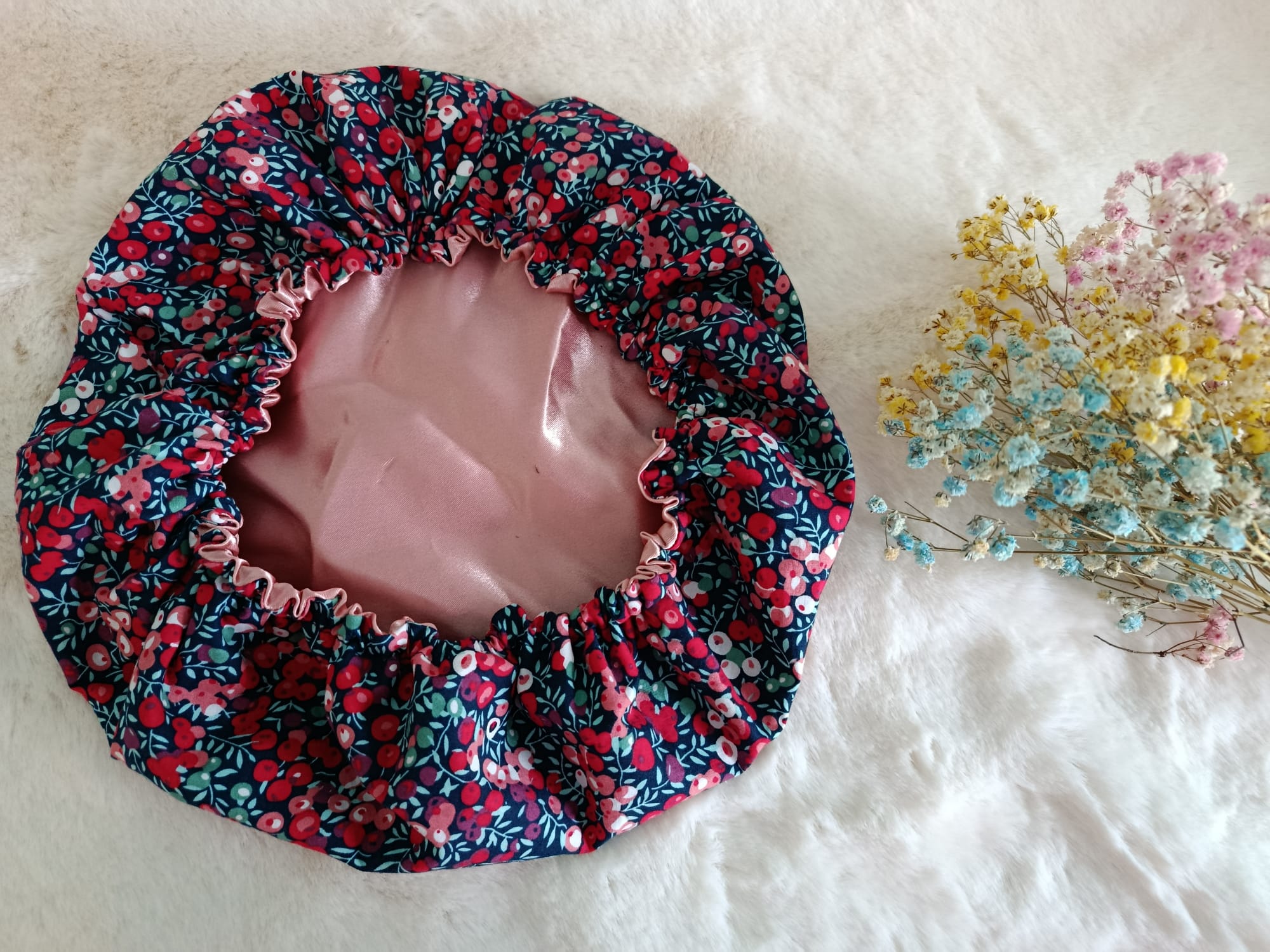 | Motifs bonnet de soin | Cerises, Fleuri fond vieux rose, Oliviers rouges, Petites fleurs, Plumes de paons |