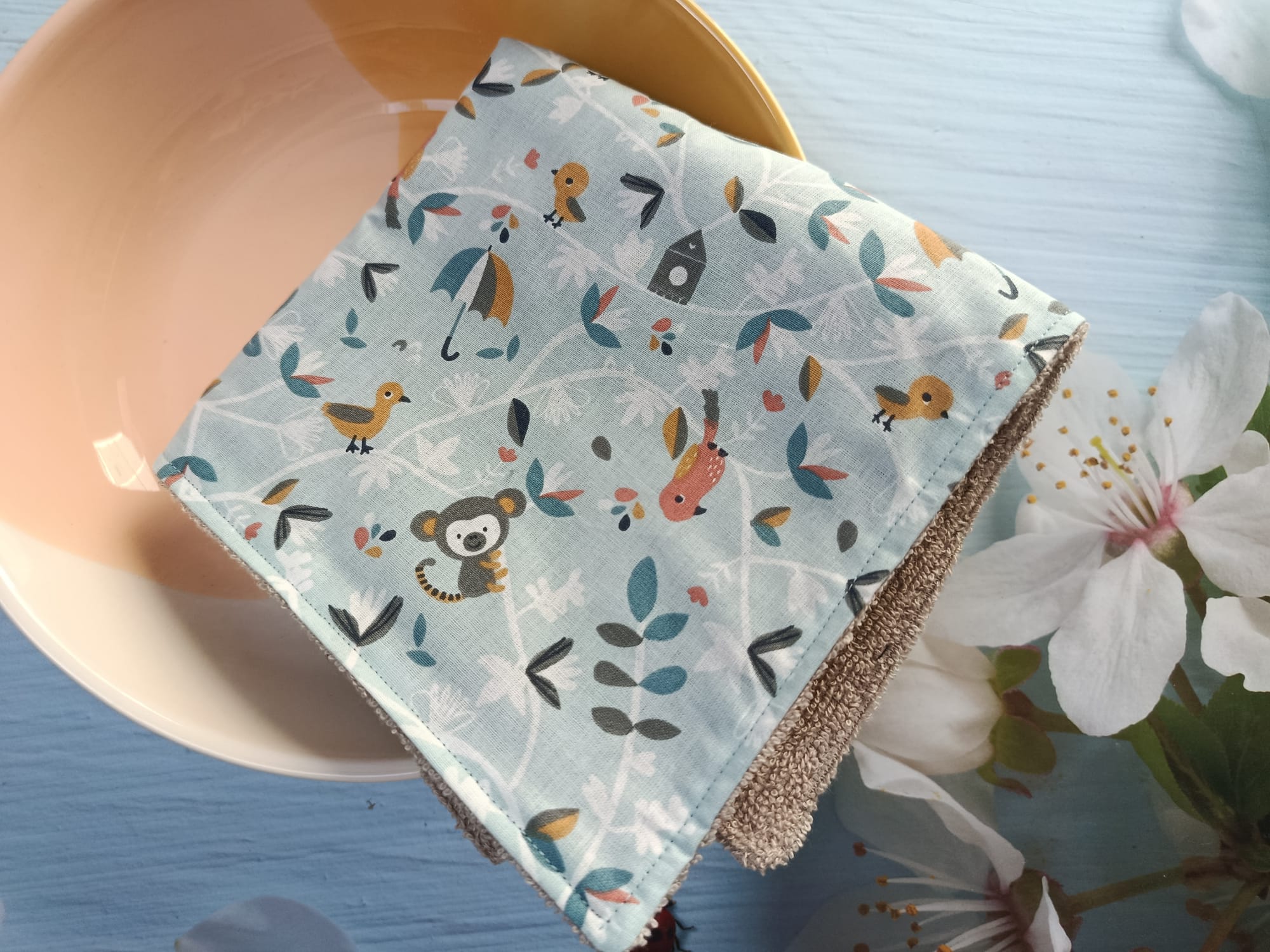 Lavable et réutilisable, cette serviette comporte une face décorative en coton, et l’autre en éponge bambou, très absorbante et facile d’entretien.